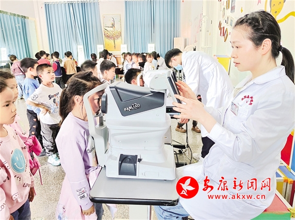 4月17日,漢陰縣婦幼保健院到蒲溪鎮(zhèn)小學(xué)教育集團(tuán)開展學(xué)生視力檢測(cè)。 鄧永新 攝