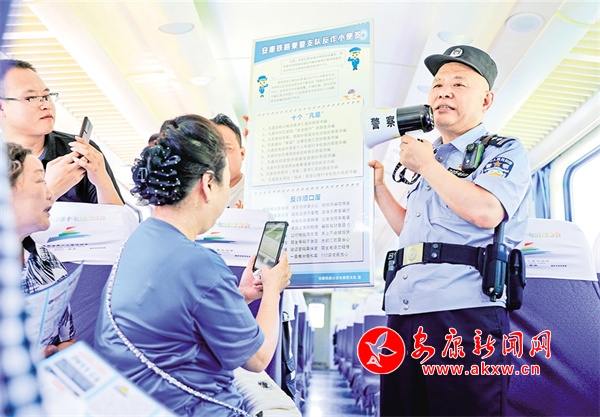 “我已經(jīng)發(fā)展了三個(gè)志愿者!”老范一邊興高采烈地說(shuō)著,一邊從他的工作包中找出志愿者袖標(biāo)及徽章。就在剛才,在站臺(tái)上引導(dǎo)旅客上車(chē)的老范憑著自己的親和力,很快就物色了幾名自愿擔(dān)任平安列車(chē)志愿者的旅客。老范隨后給志愿者佩戴袖標(biāo)及徽章,給他們開(kāi)展崗前培訓(xùn),帶他們?cè)诹熊?chē)上開(kāi)展反詐和防盜等安全宣傳。