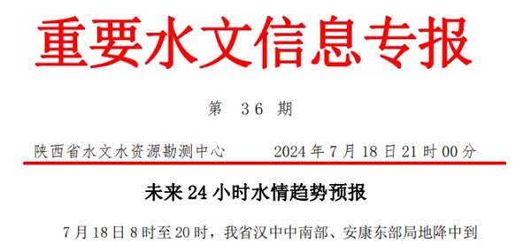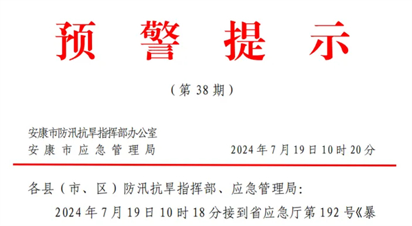 2024年7月19日10時18分接到省應(yīng)急廳第192號《暴雨橙色預(yù)警》:預(yù)計未來3小時我市漢濱區(qū)、寧陜縣降雨量將達(dá)50 毫米以上,未來6小時我市漢陰縣、石泉縣、旬陽市、白河縣將達(dá)50毫米以上,以上地區(qū)境內(nèi)發(fā)生山洪、泥石流等災(zāi)害風(fēng)險較高。