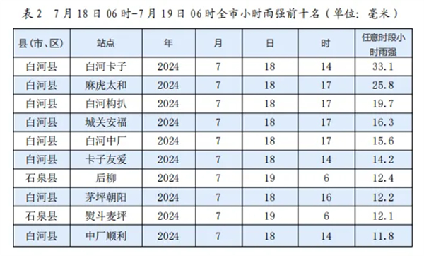 2024年7月18日白天我市大部出現(xiàn)陣雨天氣,19日05時起我市西部出現(xiàn)較強(qiáng)降水天氣。據(jù)統(tǒng)計,2024年7月18日06時至7月19日06時安康市平均雨量為6.1毫米,其中單站雨量最大為白河卡子氣象監(jiān)測站48.4毫米,縣市平均雨量最大為白河縣15.3毫米,最大小時雨強(qiáng)出現(xiàn)在白河卡子氣象監(jiān)測站33.1毫米(18日13時-14時)。全市共有235個站出現(xiàn)了降雨(大于0.1毫米),10毫米(中雨)以上有41站,25毫米(大雨)以上有8站。共有16站次小時雨強(qiáng)超過10毫米,2站次小時雨強(qiáng)超過20毫米。