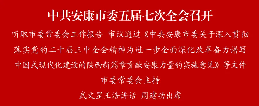全會由市委常委會主持。市委書記武文罡講話并就《中共安康市委關于深入貫徹落實黨的二十屆三中全會精神為進一步全面深化改革奮力譜寫中國式現(xiàn)代化建設的陜西新篇章貢獻安康力量的實施意見》作說明。市委副書記、市長王浩部署經(jīng)濟工作。市政協(xié)主席周建功出席會議。市委常委、統(tǒng)戰(zhàn)部部長、政法委書記寇全安就《中共安康市委關于在中國式現(xiàn)代化道路上建設平安祥和幸福安康的實施意見》作說明,市委常委、市紀委書記、市監(jiān)委主任羅曉君就《中共安康市委關于在中國式現(xiàn)代化道路上建設風清氣正幸福安康的實施意見》作說明。