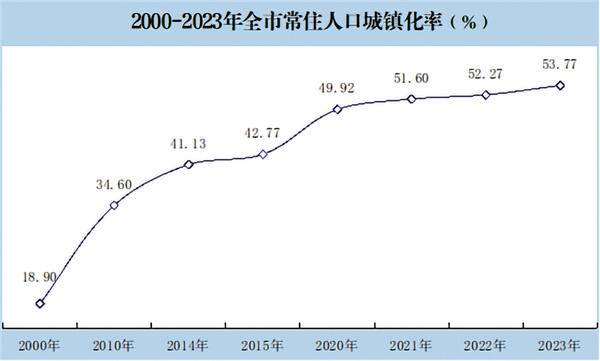 城鎮(zhèn)化步伐明顯加快。1949年,安康總?cè)丝?46.75萬(wàn)人,其中農(nóng)業(yè)人口占89.4%,屬于典型傳統(tǒng)的農(nóng)村社會(huì),交通不便,人員相對(duì)封閉不流動(dòng)。改革開(kāi)放后,市場(chǎng)經(jīng)濟(jì)體制逐步建立,特別是2000年撤地設(shè)市,對(duì)安康具有劃時(shí)代和里程碑的意義。2021年旬陽(yáng)撤縣設(shè)市,成為陜南首個(gè)縣級(jí)市,標(biāo)志著全市城鎮(zhèn)化步伐邁向更高水平。全市抓住東部勞動(dòng)密集型產(chǎn)業(yè)向中西部轉(zhuǎn)移的機(jī)遇,依托易地搬遷集中安置點(diǎn),大力興辦新社區(qū)工廠,把農(nóng)民變?yōu)榫用,大力開(kāi)展新環(huán)境、新服務(wù)、新產(chǎn)業(yè)、新民風(fēng)、新生活“五新”社區(qū)創(chuàng)建工作,完善配套設(shè)施,健全服務(wù)體系,城鎮(zhèn)化建設(shè)步伐顯著加快。2023年,全市戶(hù)籍人口300.75萬(wàn)人,常住人口245.72萬(wàn)人。常住人口城鎮(zhèn)化率由2000年的18.9%,提高到2023年的53.77%,23年間提高了34.87個(gè)百分點(diǎn)。