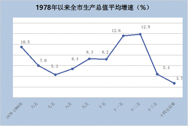 追趕超越步履堅(jiān)實(shí)。從增速看,“六五”到“十五”年均增速為個(gè)位數(shù);“十一五”“十二五”時(shí)期發(fā)展較快,年均增速兩位數(shù),“十三五”年均增長(zhǎng)5.4%,“十四五”前三年平均增長(zhǎng)3.7%。從具體年份看,2007—2016年連續(xù)10年保持兩位數(shù)增長(zhǎng),其中2012年增長(zhǎng)15.2%。自2009年起,全市GDP增速持續(xù)高于全省平均水平,尤其是2015年躍居全省第一,2015—2019年連續(xù)5年保持全省首位,呈后來(lái)居上、追趕超越之勢(shì)。2020年受疫情沖擊,增速回落至全省第9位,2023年全市經(jīng)濟(jì)平穩(wěn)恢復(fù),增長(zhǎng)1.7%,發(fā)展進(jìn)入新常態(tài)。