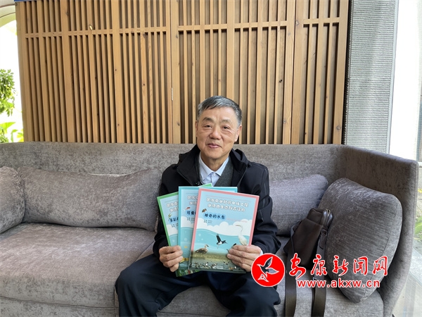 在瀛湖翠屏島上,采訪團(tuán)采訪了退休教師林俊禮。林俊禮今年70歲。他從2015年開始用相機(jī)記錄調(diào)查漢江陜西段動植物,依據(jù)一手資料編寫了國家南水中線水源地生態(tài)科普三部曲《神奇的水鳥》《可愛的魚類》《多彩的水生植物》,來宣傳漢江陜西段美好生態(tài)資源。