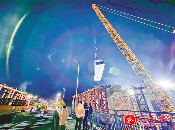 11月26日零點左右,七里溝立交主線鋼箱梁第一榀架設(shè)。