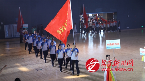 開幕式在暖場(chǎng)節(jié)目《幸福安康》的表演中拉開序幕。伴隨著高昂而優(yōu)美的旋律,儀仗隊(duì)隊(duì)員護(hù)擁著會(huì)旗與代表本屆市運(yùn)會(huì)核心主題的標(biāo)語隊(duì)步伐矯健地入場(chǎng)。由全市教育、體育、科技、文化、衛(wèi)生五大領(lǐng)域的杰出代表組成的觀禮團(tuán)代表從主席臺(tái)前走過。緊隨其后的裁判員隊(duì)伍、13個(gè)青少年組運(yùn)動(dòng)員代表團(tuán)、32 個(gè)行業(yè)組運(yùn)動(dòng)員代表團(tuán)闊步入場(chǎng),展現(xiàn)出朝氣蓬勃的精神風(fēng)貌。入場(chǎng)儀式完畢,全場(chǎng)起立,面向國旗,奏唱中華人民共和國國歌。運(yùn)動(dòng)員代表與裁判員分別宣誓。