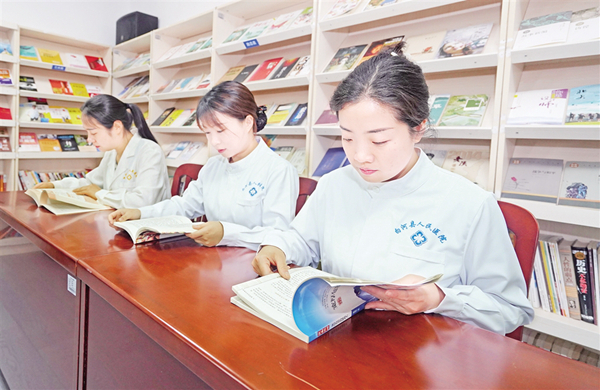 4月23日,白河縣人民醫(yī)院護(hù)士利用工作間隙在圖書(shū)角專(zhuān)注閱讀。(伍渭康 攝)  gBy安康新聞網(wǎng)