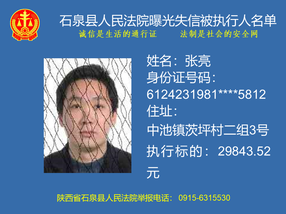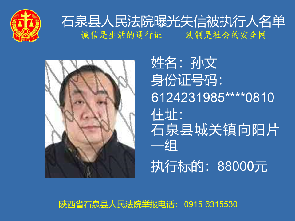 為了進(jìn)一步加大執(zhí)行力度,保障勝訴當(dāng)事人的合法權(quán)益,推進(jìn)社會誠信體系建設(shè),依照《中華人民共和國民事訴訟法》、《最高人民法院關(guān)于公布失信被執(zhí)行人名單信息的若干規(guī)定》等法律、司法解釋的有關(guān)規(guī)定,現(xiàn)對一批已進(jìn)入執(zhí)行程序,且尚未全部履行義務(wù)的被執(zhí)行人進(jìn)行媒體曝光,歡迎廣大群眾支持石泉縣人民法院的工作,向我院提供被執(zhí)行人的財產(chǎn)線索,使生效法律文書能夠得到切實執(zhí)行,讓人民群眾切實感受到公平正義就在身邊。