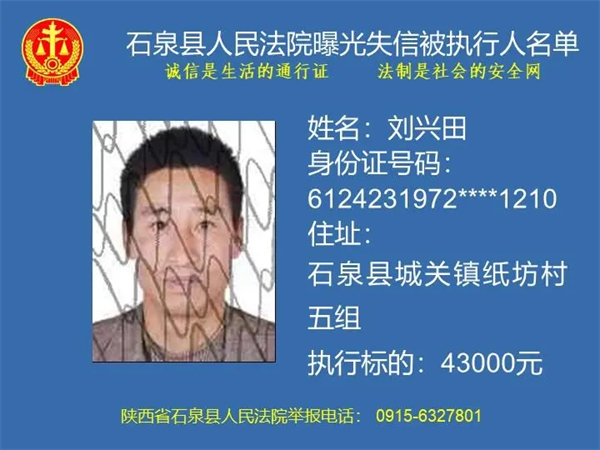 為了進(jìn)一步加大執(zhí)行力度,保障勝訴當(dāng)事人的合法權(quán)益,推進(jìn)社會(huì)誠信體系建設(shè),依照《中華人民共和國民事訴訟法》《最高人民法院關(guān)于公布失信被執(zhí)行人名單信息的若干規(guī)定》等法律、司法解釋的有關(guān)規(guī)定,現(xiàn)對一批已進(jìn)入執(zhí)行程序,且尚未全部履行義務(wù)的被執(zhí)行人進(jìn)行媒體曝光,歡迎廣大群眾支持石泉縣人民法院的工作,向我院提供被執(zhí)行人的財(cái)產(chǎn)線索,使生效法律文書能夠得到切實(shí)執(zhí)行,讓人民群眾切實(shí)感受到公平正義就在身邊。