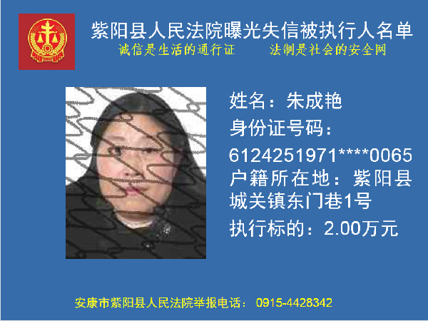 被執(zhí)行人朱成艷,你因不履行(2017)陜0924民初241號民事判決書確定的義務(wù),已被紫陽縣人民法院納入失信被執(zhí)行人名單庫依法進行信用懲戒。信用懲戒范圍包括但不限于以下措施: