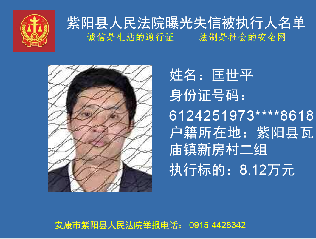 被執(zhí)行人匡世平,你因不履行(2017)陜0924民初241號(hào)民事判決書確定的義務(wù),已被紫陽縣人民法院納入失信被執(zhí)行人名單庫依法進(jìn)行信用懲戒。信用懲戒范圍包括但不限于以下措施: