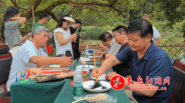 活動(dòng)現(xiàn)場,8位漢陰本土?xí)覔]毫潑墨、筆走龍蛇,為到場嘉賓和游客書寫、贈(zèng)送書法作品,案幾前擠滿圍觀人群。一幅幅寓意美好、字體優(yōu)美、散發(fā)著墨香的書法作品,引得眾人連連稱贊,紛紛拍照打卡。