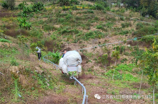 2022年,常州市新北區(qū)對(duì)口幫扶嵐皋縣聯(lián)絡(luò)組專(zhuān)門(mén)撥付蘇陜協(xié)作資金350萬(wàn)元,為當(dāng)?shù)匕l(fā)展獼猴桃、碧根果等產(chǎn)業(yè)的村子安裝山地軌道運(yùn)輸車(chē)20公里,直接讓3500畝土地的種植戶(hù)受益。軌道運(yùn)輸車(chē)的安裝,讓當(dāng)?shù)厝罕姀拇烁鎰e了依靠人力肩挑背扛的歷史。包括獼猴桃、黃豆、紅薯等在內(nèi)的所有莊稼,從此在地里收獲后,只需要主人裝入軌道運(yùn)輸車(chē),就可以直接送到農(nóng)用車(chē)上,然后拉回家。
