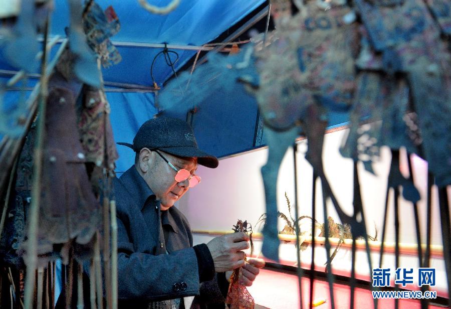 3月15日,平利縣國(guó)家非遺文化傳承人吳承權(quán)正在準(zhǔn)備道具為群眾表演弦子腔。在巴山深處的陜西平利縣,活躍著一批皮影戲弦子腔藝人。他們常常利用休息日走上街頭,……