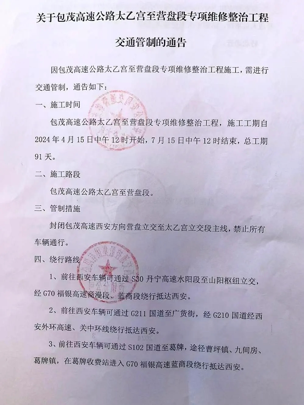 4月15日12時起,包茂高速公路太乙宮至營盤段交通管制