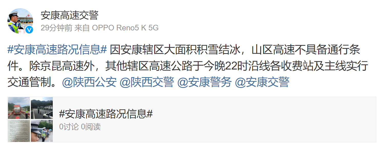 據(jù)安康高速交警消息:因安康轄區(qū)大面積積雪結(jié)冰,山區(qū)高速不具備通行條件。除京昆高速外,其他轄區(qū)高速公路于今晚(2月22日)10時沿線各收費(fèi)站及主線實(shí)行交通管制。 2sn安康新聞網(wǎng)