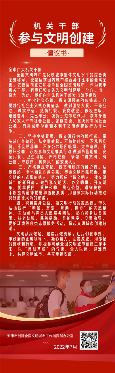 全國文明城市是反映城市整體文明水平的綜合類榮譽稱號,也是目前國內(nèi)城市綜合類評比中的最高榮譽。安康目前正在積極爭創(chuàng)全國文明城市,作為我市機關(guān)干部,有責(zé)任和義務(wù)為文明創(chuàng)建盡一份心、出一份力。為此,我們向全體機關(guān)干部發(fā)出如下倡議: