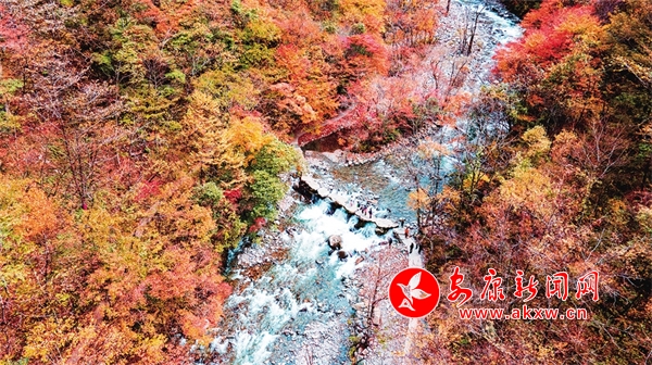 石泉縣城關(guān)鎮(zhèn)楓樹村秋韻正濃,山川色染繽紛,與日出晨霧交相輝映。董長松 攝