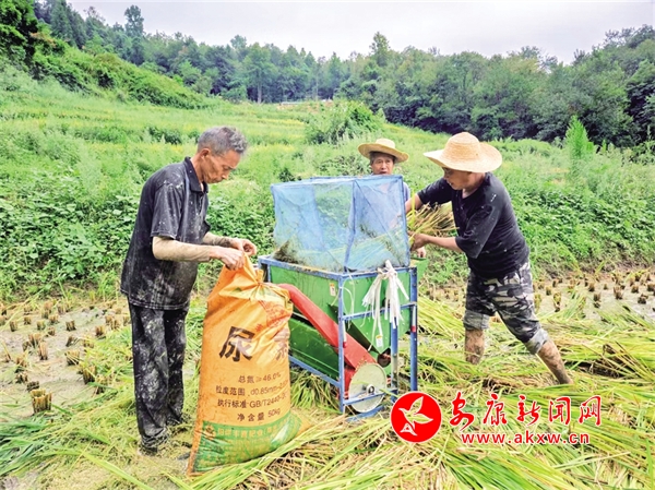 連日來,高溫天氣持續(xù),漢濱區(qū)吉河鎮(zhèn)吉河壩社區(qū)大片水稻已經(jīng)成熟,農(nóng)戶搶抓晴好天氣開鐮收割,一派繁忙的豐收景象。該區(qū)40萬畝秋糧作物開鐮收獲以來,農(nóng)業(yè)農(nóng)村部門先后組織調(diào)運2000余臺(套)收割、脫粒等農(nóng)機(jī)參與秋收工作。李勝福 攝