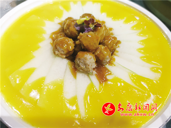 這是一道舌尖美味,制作時(shí)提前把海參、青筍、杏鮑菇、紅蘿卜切好汆水,備好墨魚花、蝦仁、棒骨高湯、南瓜泥、咸蛋黃,炸好香米,客人餐前,把炸好的香米復(fù)炸香脆裝盤,再把雞油、咸蛋黃、高湯和南瓜泥放入鍋內(nèi)翻炒,然后倒入海參、青筍、杏鮑菇、紅蘿卜、墨魚花、蝦仁等食材,燒開(kāi)勾芡,調(diào)制成濃香金湯,起鍋裝盆,端到客人餐桌,當(dāng)著食客的面將脆米倒入盛裝金湯的土盆里,攪拌均勻即可。這道菜看著五顏六色、金黃油亮,吃著養(yǎng)胃養(yǎng)顏,湯汁鮮美,營(yíng)養(yǎng)豐富。