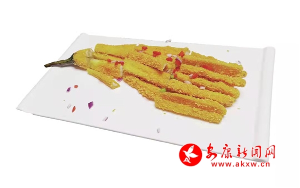 推薦理由:這道菜選用長形的紫氣皮茄子,削皮后橫豎刀切成佛手狀的粗條,均勻給每一根茄條拍上調(diào)味后的干淀粉、抹上雞蛋液,再裹上一層面包糠,下油鍋炸至表皮金黃,切成長短適合入口的大小,點綴上洋蔥碎和辣椒丁便可擺盤上桌了。菜品顏色金黃燦爛,看一眼便讓人食欲大開,夾一塊送入嘴中,外皮酥脆化渣,內(nèi)部是茄肉的軟嫩多汁,茄子的香味透過面包糠的油香層層滲入口腔,余味悠長,是一道老少皆宜的美味佳肴。RY7安康新聞網(wǎng)