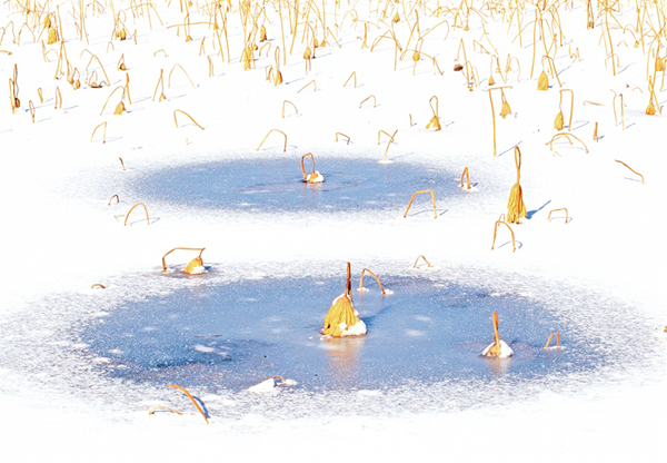 我的攝影創(chuàng)作圍繞生命的痕跡、時間的隱喻兩個主題。在《嘉實擷芳·野圃瑤音》中,菜園的微觀生態(tài)被賦予交響樂般的節(jié)奏——葫蘆藤的螺旋曲線是生命的律動,西紅柿根莖的垂直排列是生長的秩序,蚜蟲蝕痕的細節(jié)則暗喻生態(tài)的共生與抗爭。而在《澄漪棹影·沙月溯光》里,榮成海岸的冬夏對比成為時間的隱喻,結(jié)冰湖面上的凋敗蓮蓬是流逝凝固的時光,夏日海邊的金色水洼則是流動的永恒。我癡迷于捕捉這種矛盾與共生——就像用冷暖色調(diào)碰撞出畫面的張力,也用虛實構(gòu)圖處理每一張照片,期待每一張照片是個性鮮明,讓人耳目一新。